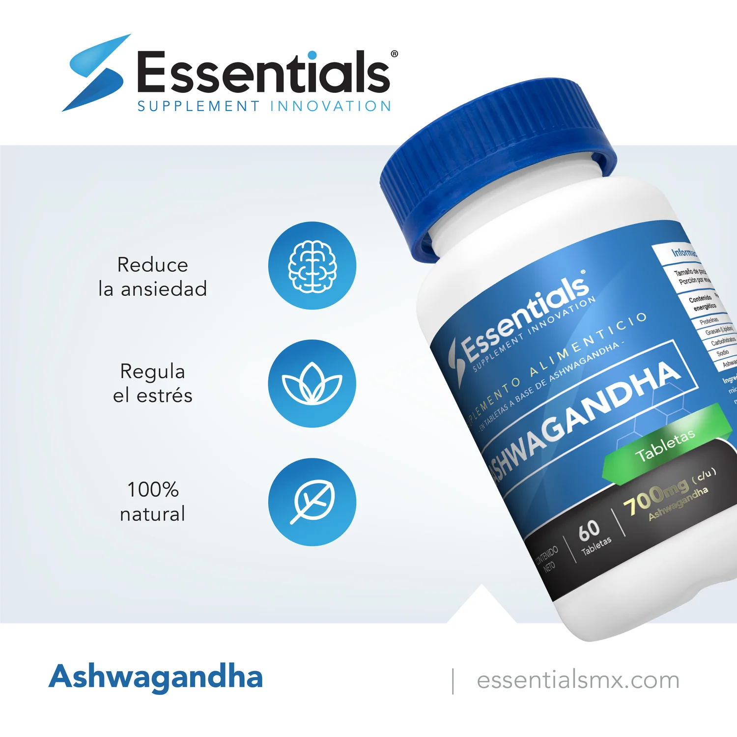 Sé el primero en valorar “ESSENTIALS ASHWAGANDHA 60 TABLETS 700MG”